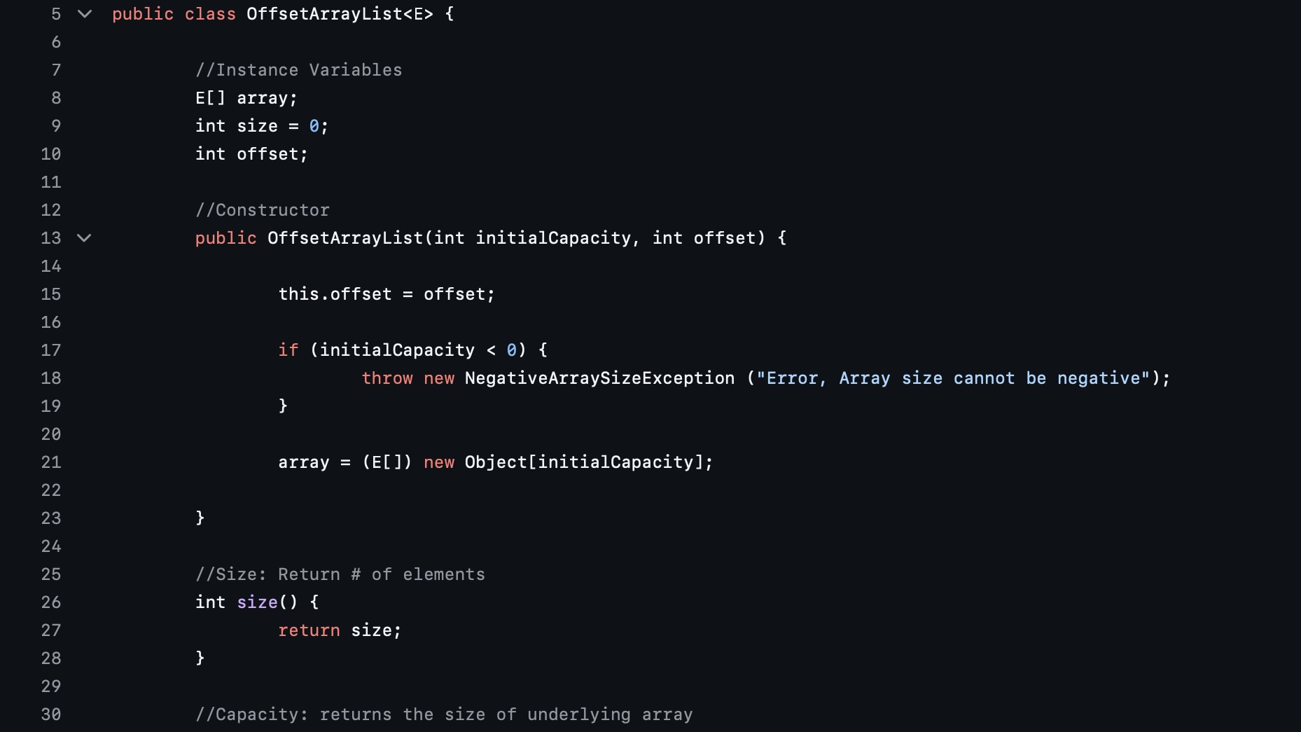 The OffsetArrayList project is a custom implementation of a resizable array list in Java with an added offset feature. This implementation allows users to specify an initial offset for indexing elements, which can be particularly useful in certain scenarios where the list’s logical indexing does not start from zero. The class provides a variety of methods to manage the list, including add, remove, get, set, and methods to retrieve the size, capacity, and offset of the list. The add method is designed to handle adding elements both at the end and at a specific index, while ensuring that the array is resized when necessary. The remove method handles the removal of elements and shifts the remaining elements accordingly.